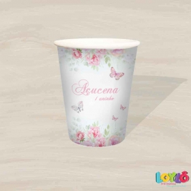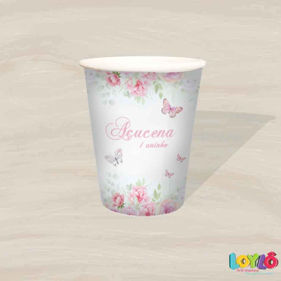 Copos personalizados no tema Jardim das borboletas rosa aquarelado floral