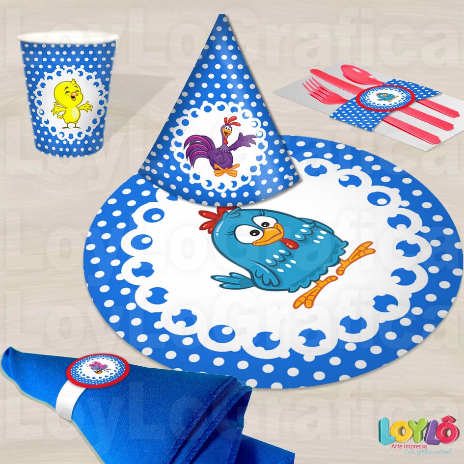 Sousplat e copo, porta talher, porta guardanapo e chapeu personalizado no tema Galinha Pintadinha
