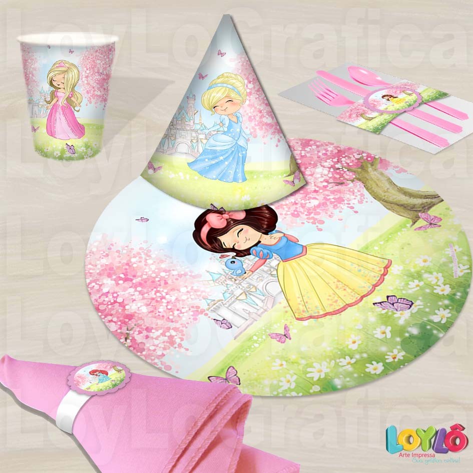 Sousplat e copo, porta talher, porta guardanapo e chapeu personalizado no tema Princesas Aquarela Baby