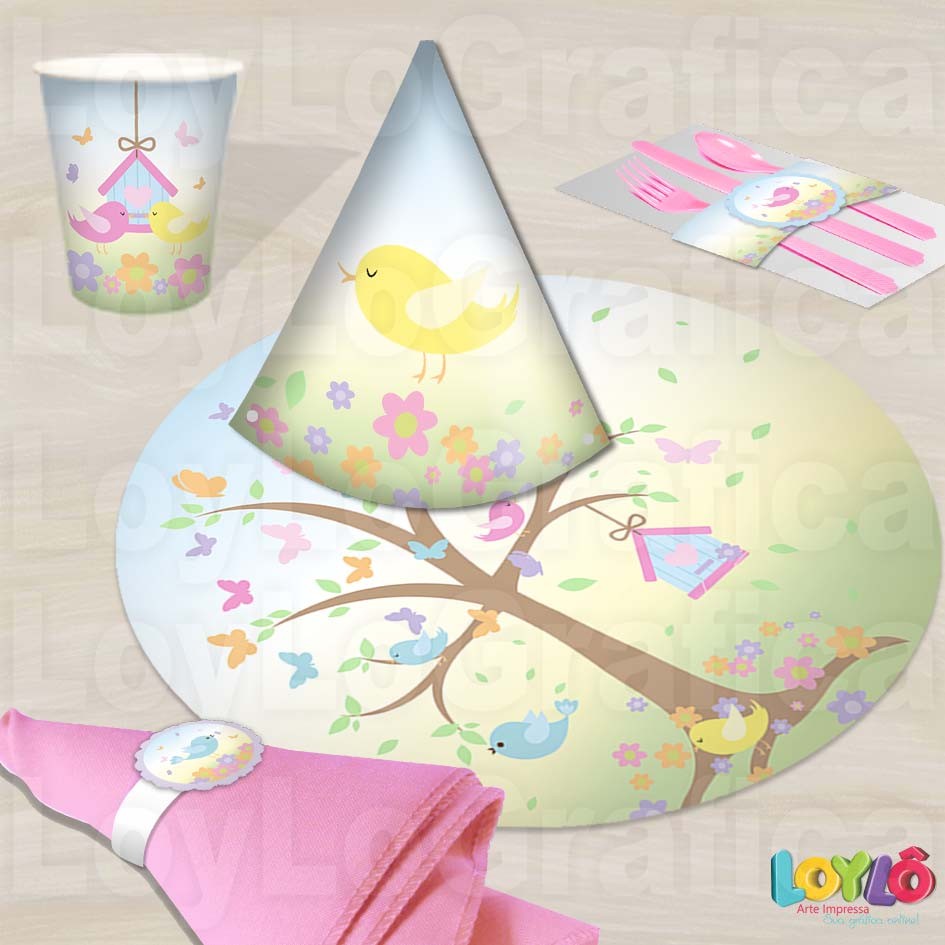 Sousplat e copo, porta talher, porta guardanapo e chapeu personalizado no tema Jardim pássaros arvores borboletas candy colors
