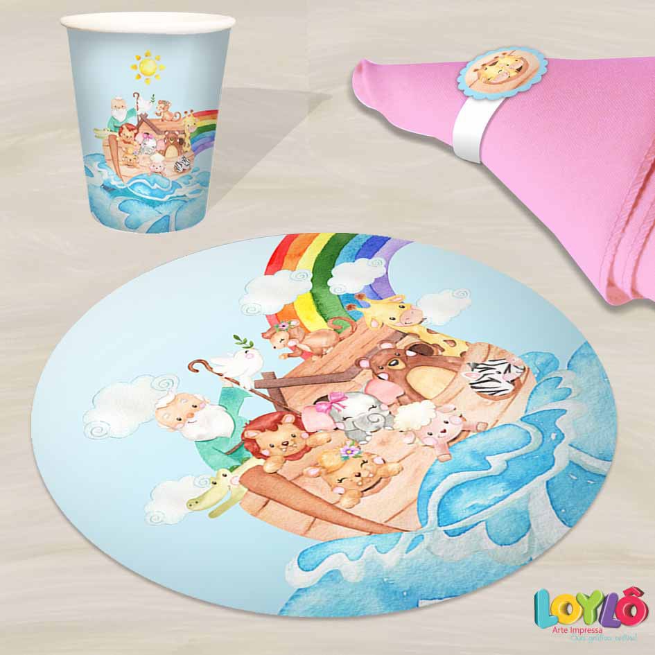 Kit Sousplat, copo e porta guardanapo personalizado no tema Arca de Noé