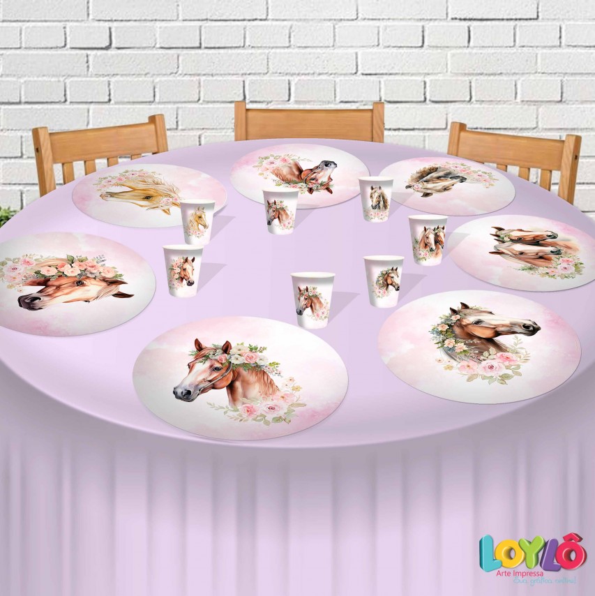 Kit mesa posta Sousplat e copinho personalizado no tema Cavalos florido Boiadeira Rosa
