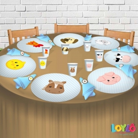 kit Sousplat personalizado no tema Fazendinha azul xadrez animais com copinho combinando
