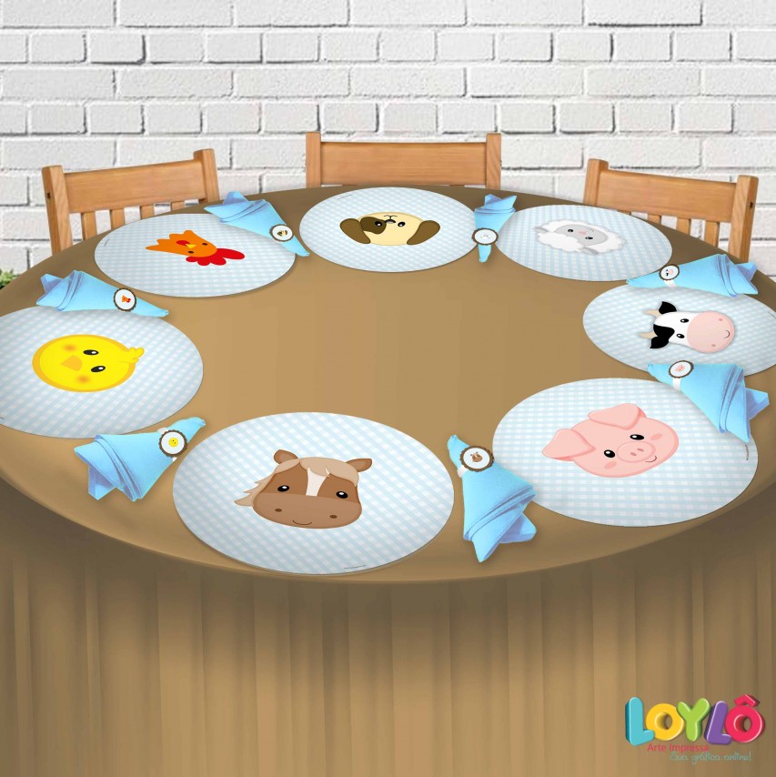 kit Sousplat personalizado no tema Fazendinha azul xadrez animais com porta guardanapo