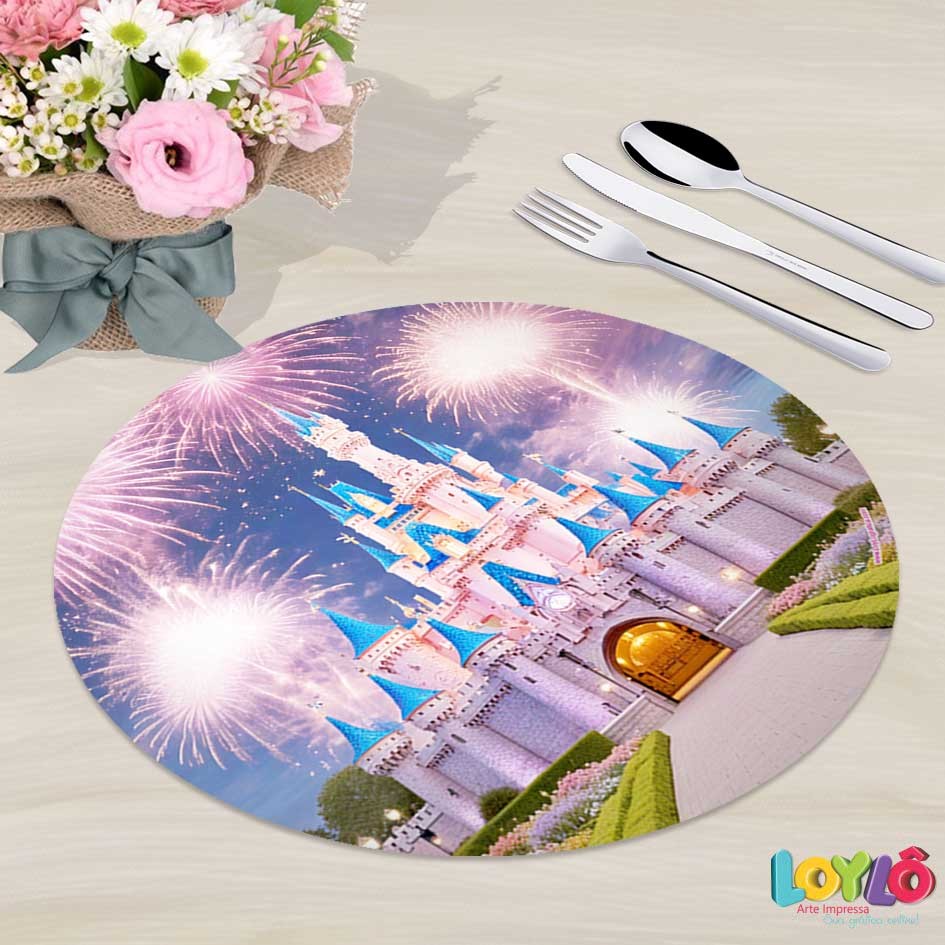 Sousplat personalizado no tema Disneylândia Disney 50 anos Castelo candy colors azul rosa