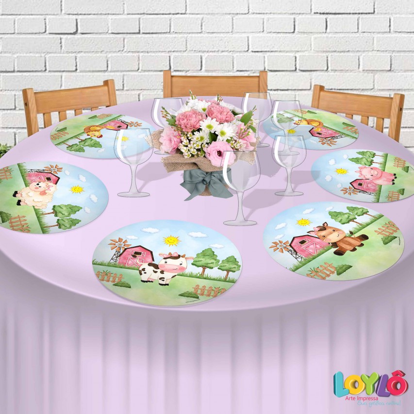 Sousplat personalizado no tema Fazendinha aquarela Rosa animais com lacinhos