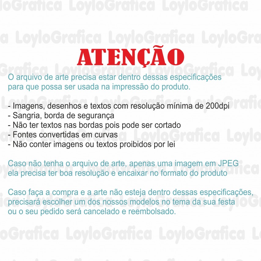 - Imagens, desenhos e logos enviados pelo cliente serão avaliados e podem ser rejeitados se não estiver de acordo com o necessário para compor a arte