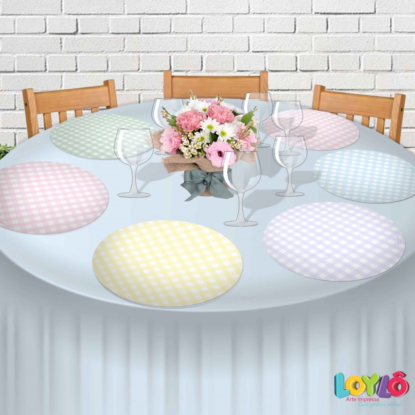 Sousplat personalizado estampado xadrez nas cores verde claro, azul claro, rosa claro, lilás e amarelo claro
